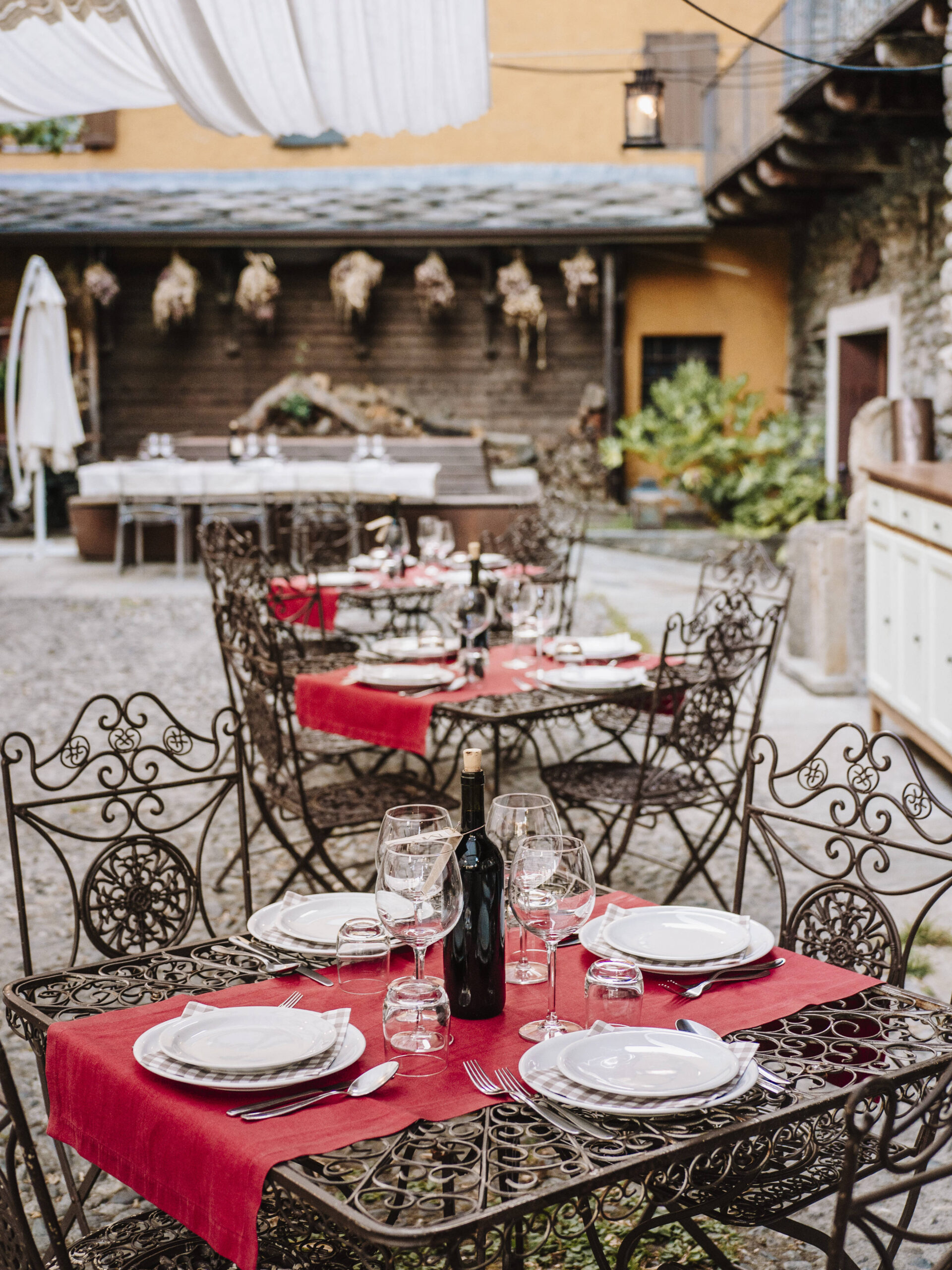 The courtyard represents the "beating heart" of our business, the core of Maison Rosset. From the courtyard, you will get to the reception hall where you will be greeted on your arrival, you will see the entrance door of the restaurant and have access to the Wellness area. During summertime, we decorate our courtyard with white, fluttering sunshade sails to protect our customers from the sun while they are having breakfast, lunch, a drink or a delicious dinner.