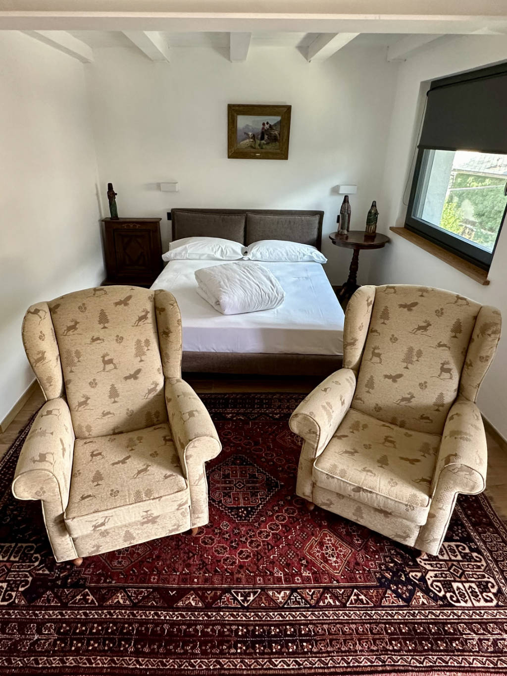 Il s'agit de notre suite mansardée, spacieuse et très lumineuse, avec une belle fenêtre donnant sur les jardins potagers et une petite terrasse orientée au sud.