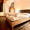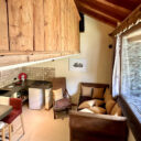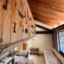 Un accueillant appartement de deux pièces sur deux niveaux, réalisé en bois précieux ancien alternant avec des matériaux modernes, avec des portes en panneaux également anciens, conçu pour accueillir des couples avec un lit double sur la mezzanine.
